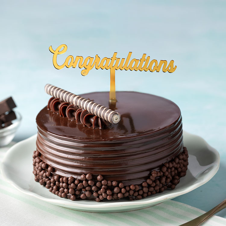 Big results call for big celebrations, decadent layers of dark cocoa ganache and moist chocolate sponge, finished with a 'Congratulations' topper that says it all. Allergens - Wheat, Dairy, Soy.